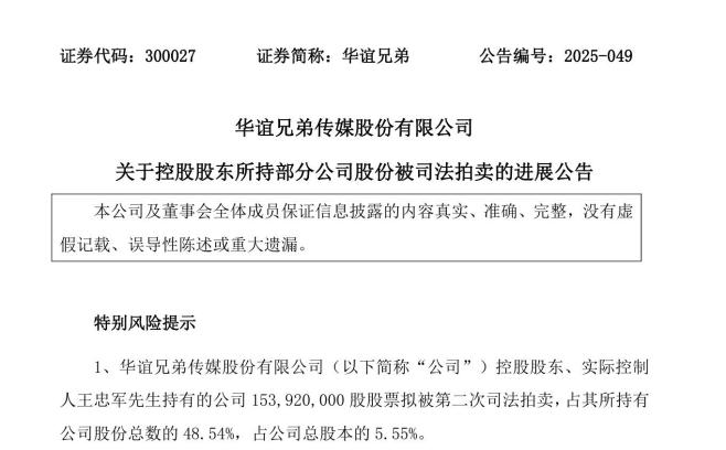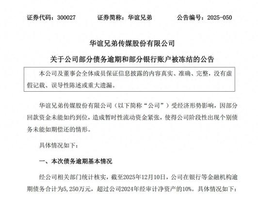 12月10日,华谊兄弟(300027)(300027.SZ)发布公告披露,截至当日公司在金融机构的逾期债务合计达5250万元,该金额已超过其2024年经审计净资产的10%,同时公司部分银行账户被冻结约人民币64万余元及少量美元。公告同时透露,公司正通过与金融机构协商续贷、处置非核心资产等方式化解危机。